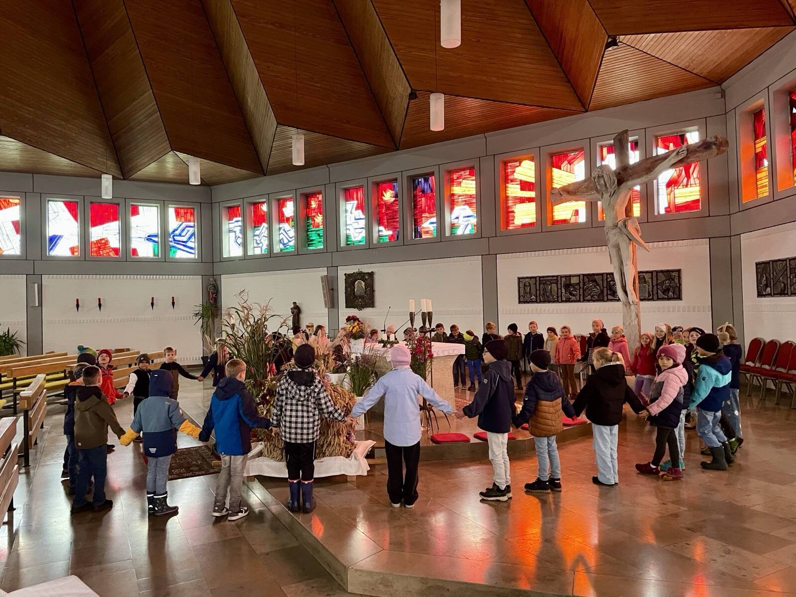 Gemeinsam sangen die Klassen religiöse Lieder und bildeten einen großen Kreis um den Altar, um gemeinsam das "Vater unser" zu beten.