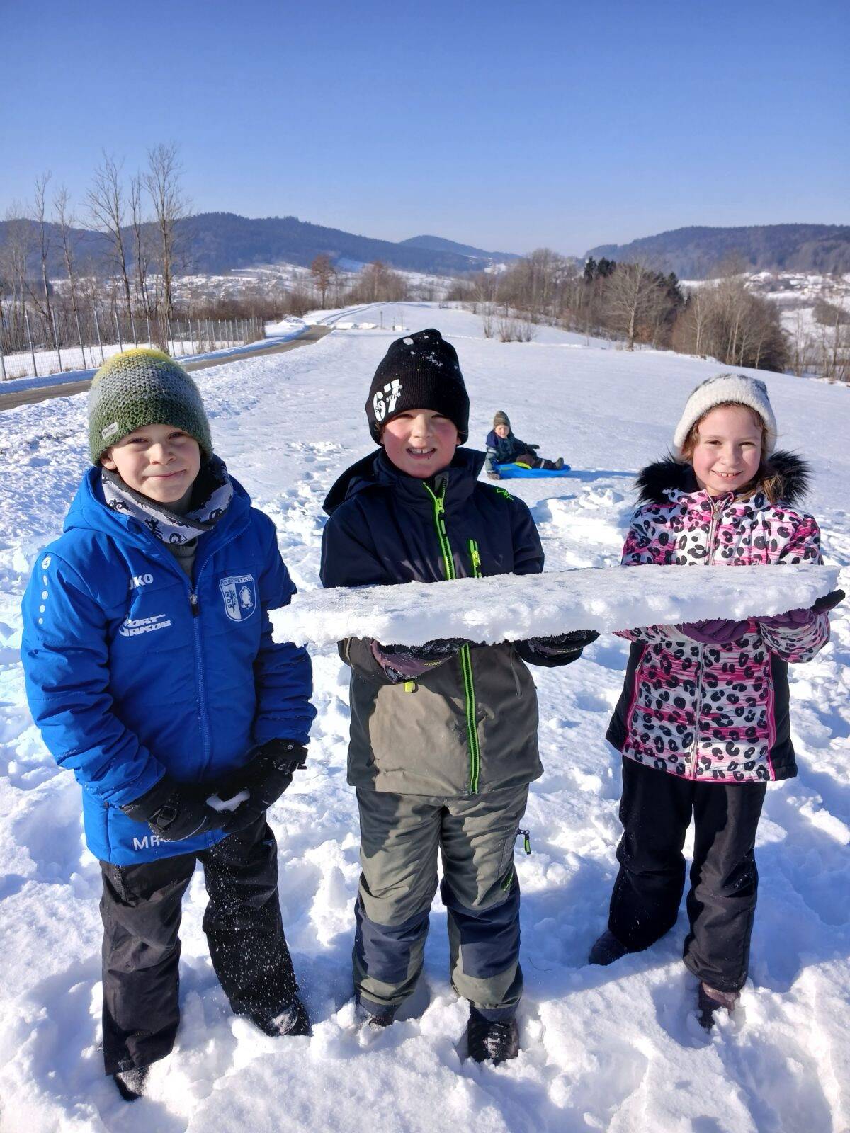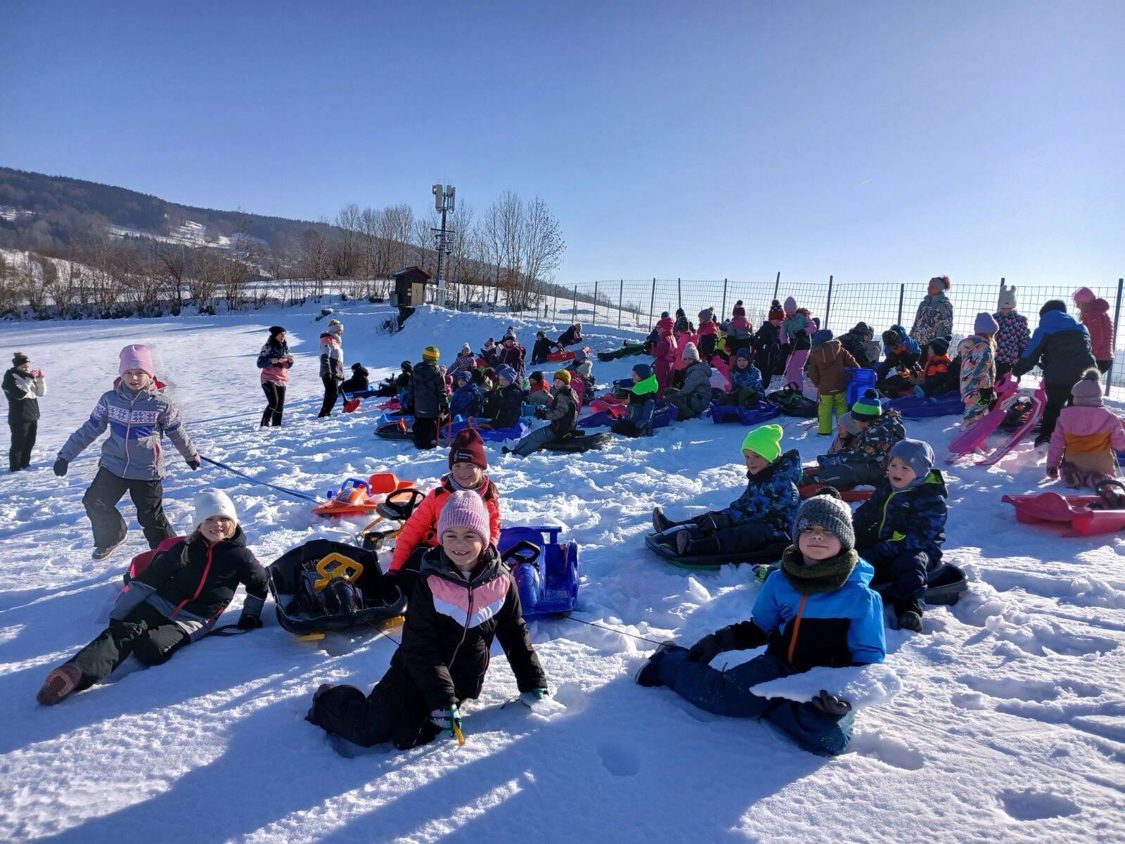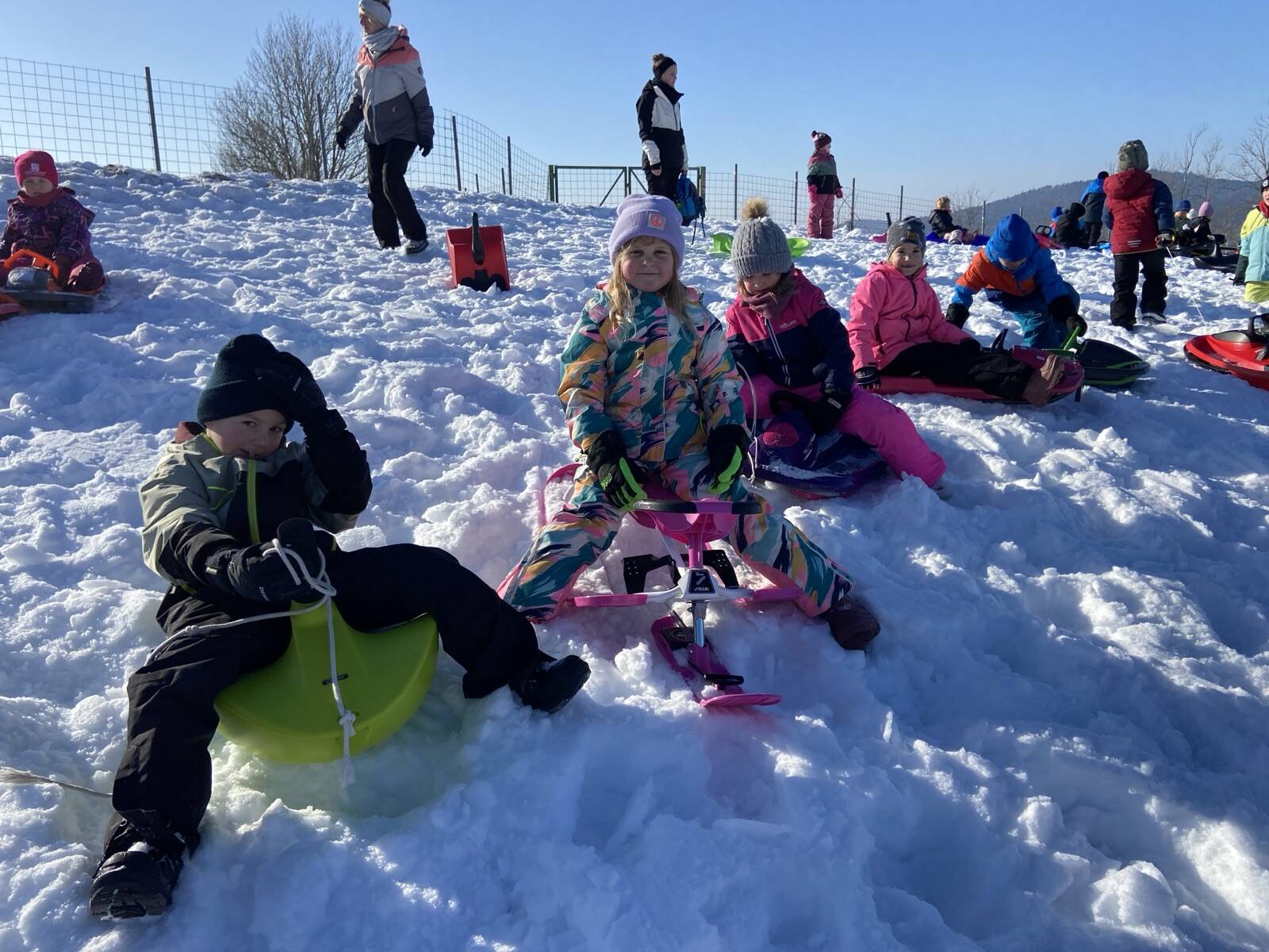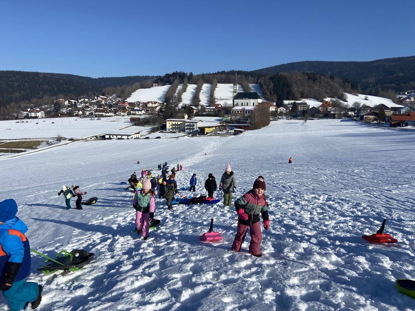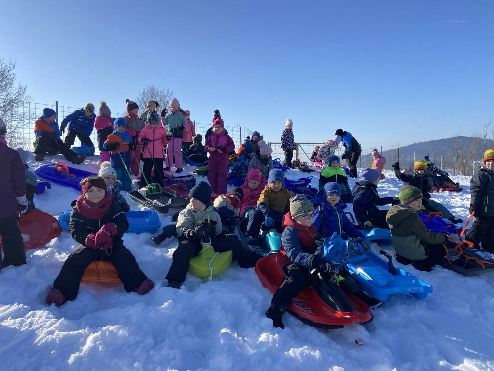 Ein weiteres Highlight war das gemeinsame Rodeln der 1. und 2. Klasse. Bei strahlendem Winterwetter verbrachten die Kinder einen fröhlichen Vormittag im Schnee. Neben viel Bewegung und Spaß stand dabei vor allem das Miteinander im Mittelpunkt. Die Kinder halfen einander beim Hochziehen der Bobs und genossen die gemeinsame Zeit im Freien.