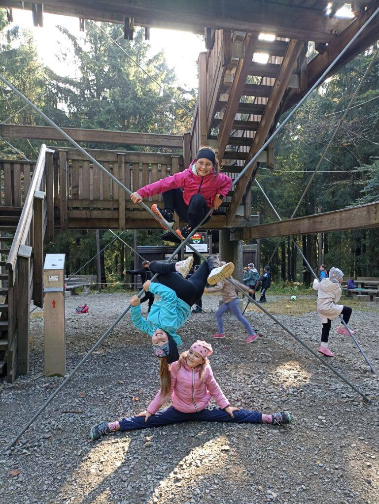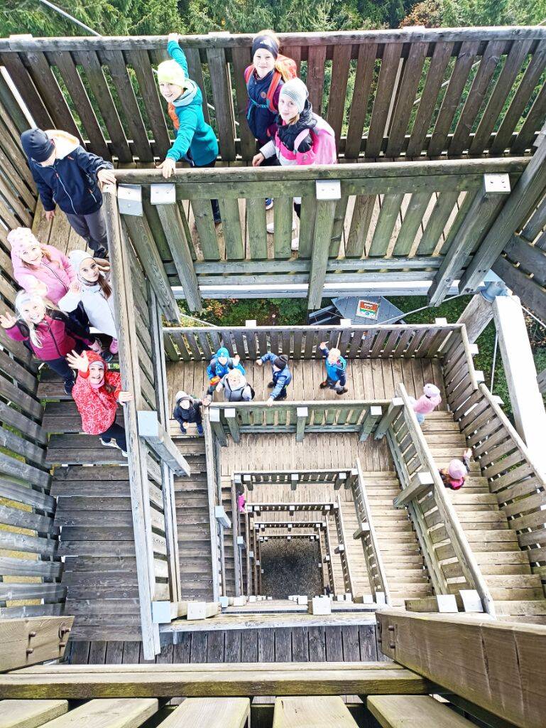 Oben angekommen, wagten sich viele mutig auf den Aussichtsturm und wurden mit einem beeindruckenden Blick über den Bayerischen Wald belohnt. Der Haidel selbst erhebt sich auf stolze 1156 Meter, der Turm misst 35 Meter in der Höhe und wer ganz nach oben wollte, musste 156 Treppenstufen erklimmen. Unter dem Turm wurde gespielt, gesungen und gerätselt: Wie hoch ist der Turm? Wie weit kann man sehen? Wie viele Stufen führen nach oben? Zahlen wurden geschätzt, gemerkt und verglichen. Ein besonderes Highlight war auch der markante Stein auf 1000 Metern über dem Meeresspiegel. Insgesamt legten die Kinder eine Wanderstrecke von 7,9 Kilometern zurück.