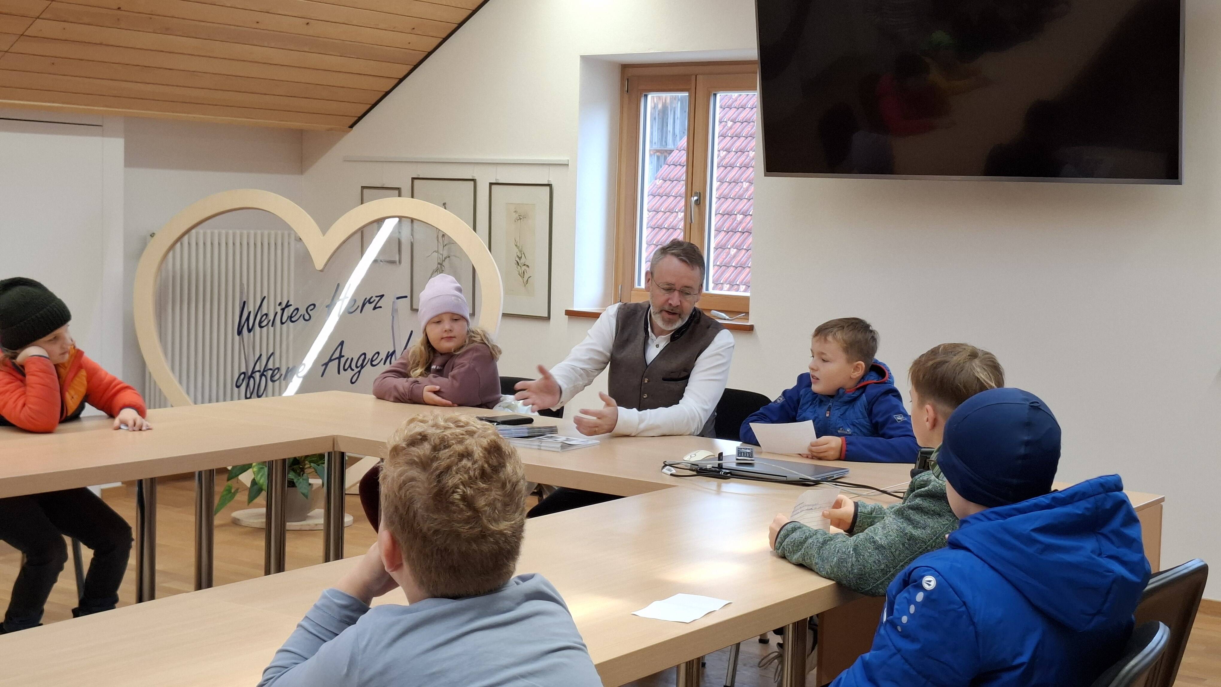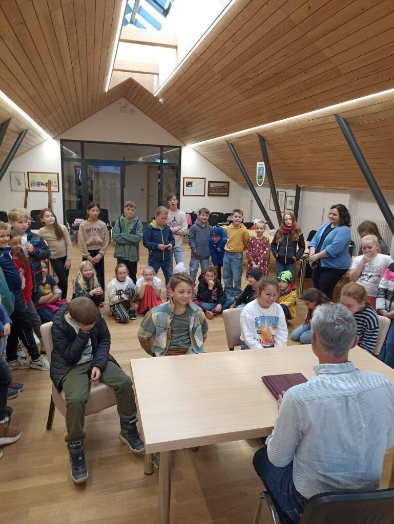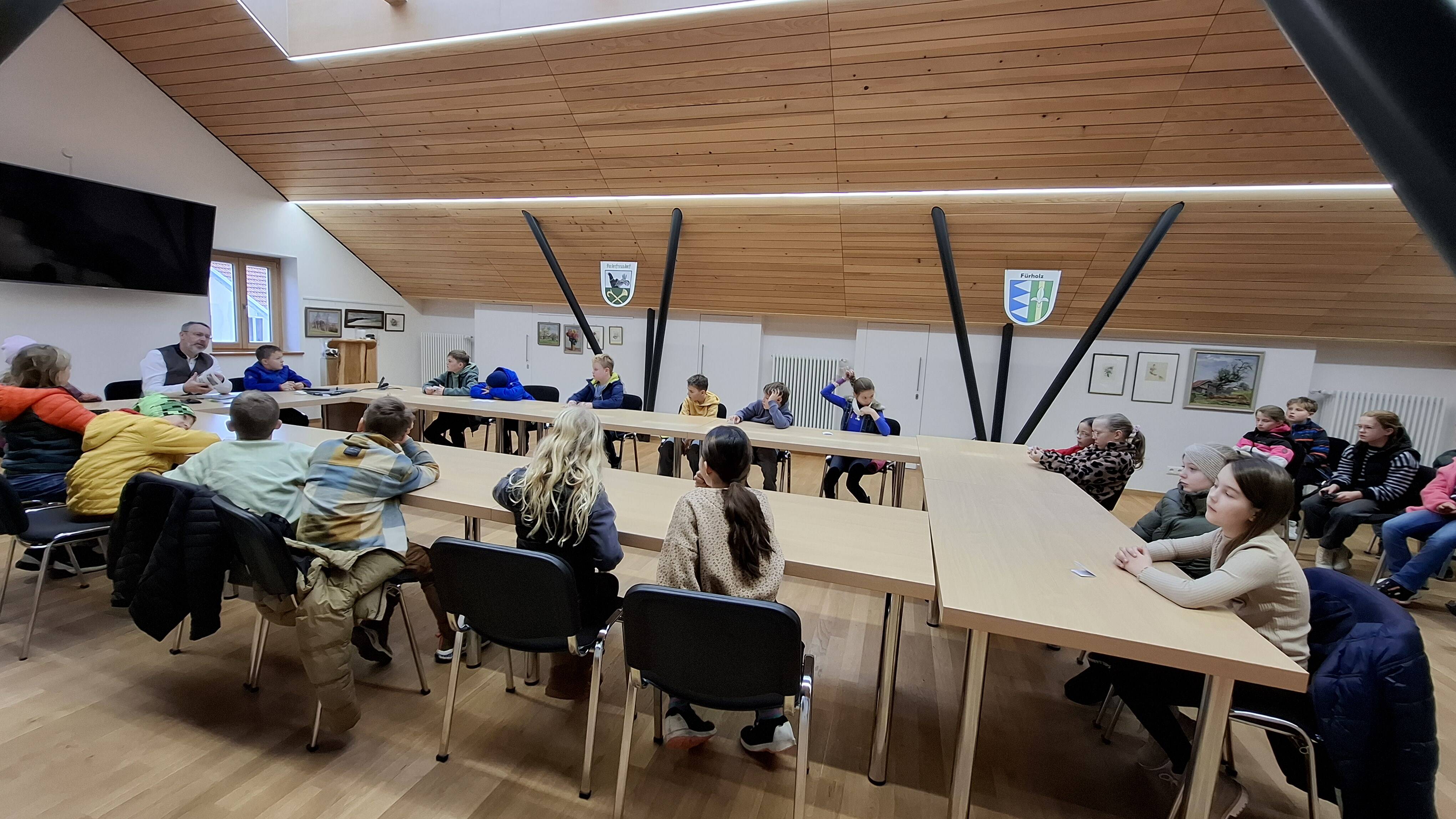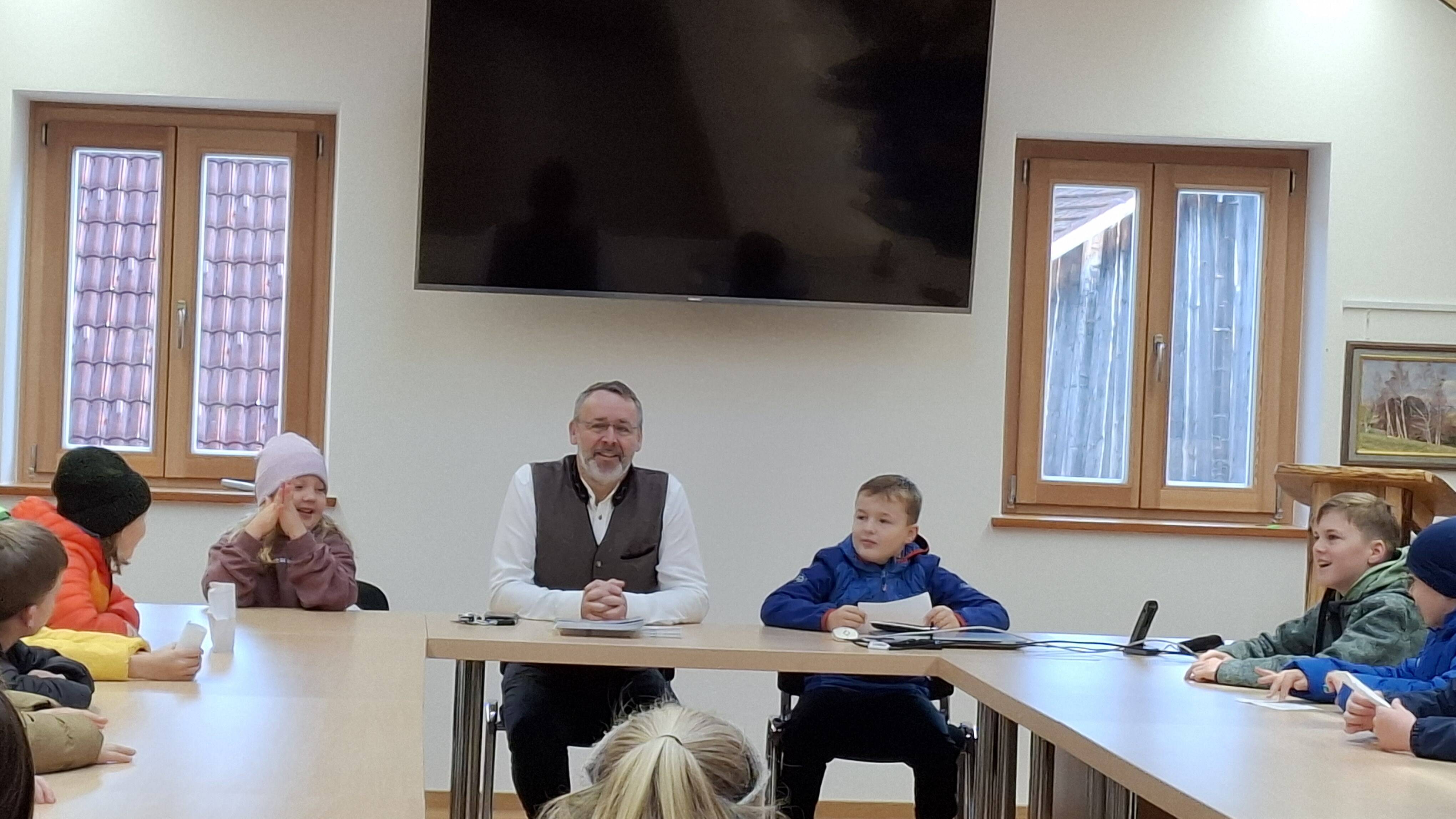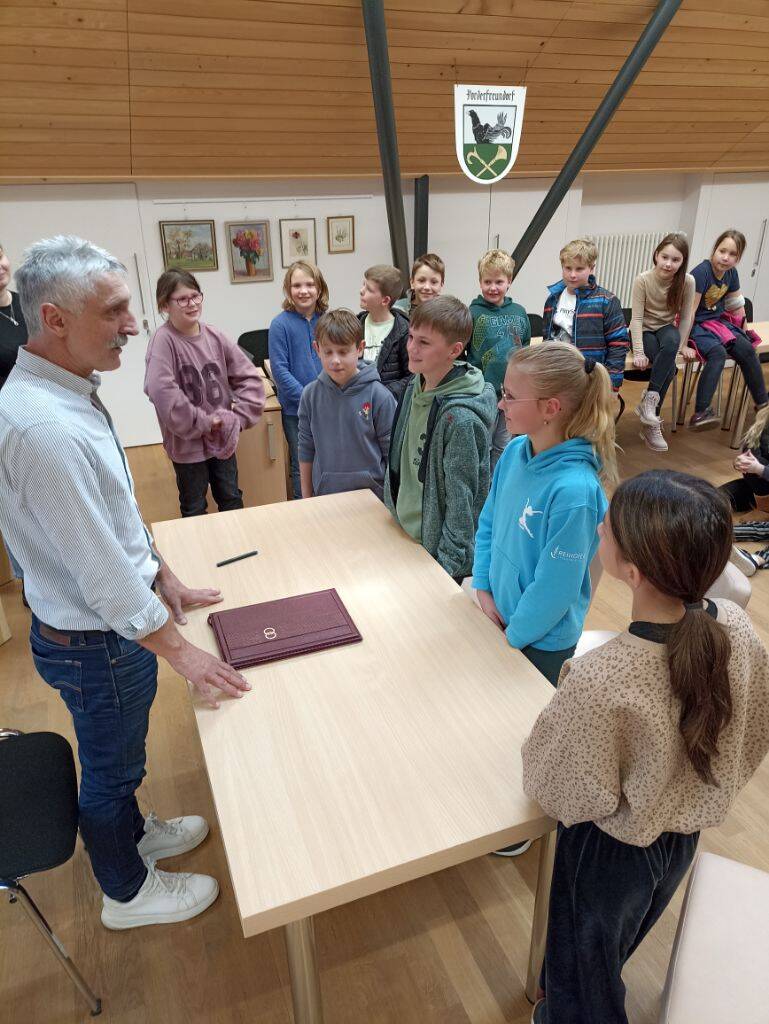 Bürgermeister Jürgen Schano empfing die Klassen im großen Sitzungsaal und stellte sich dort den vielen Fragen, die die Kinder vorbereitet hatten. Auch hatten sie zahlreichen Anträge und Wünsche im Gepäck, welche hier direkt „an den Mann“ gebracht werden konnten.