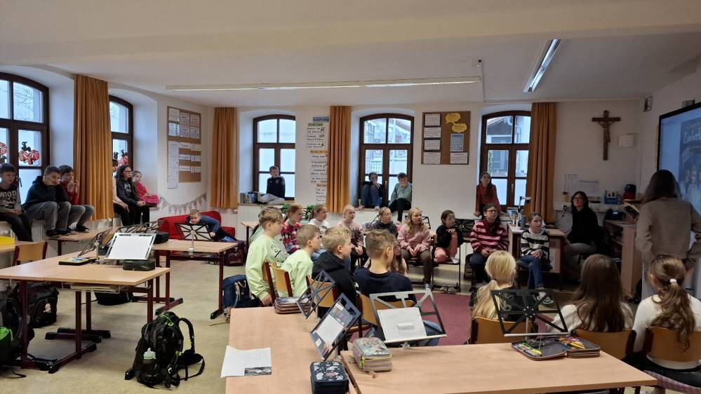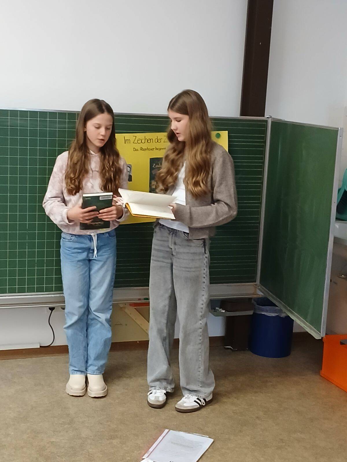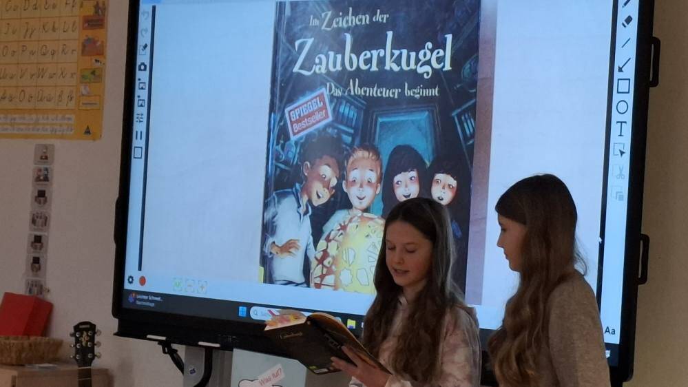 Ein besonderes Highlight war der Besuch zweier Sechstklässlerinnen des Gymnasiums Freyung, die den Schülerinnen und Schülern „Im Zeichen der Zauberkugel“ von Stefan Gemmel vorstellten. Mit viel Begeisterung lasen sie ausgewählte Kapitel vor und erzählten von ihren Lieblingsstellen. Ihre lebendige Art zu lesen sorgte dafür, dass alle Kinder gebannt zuhörten und neugierig auf die Geschichte wurden.
