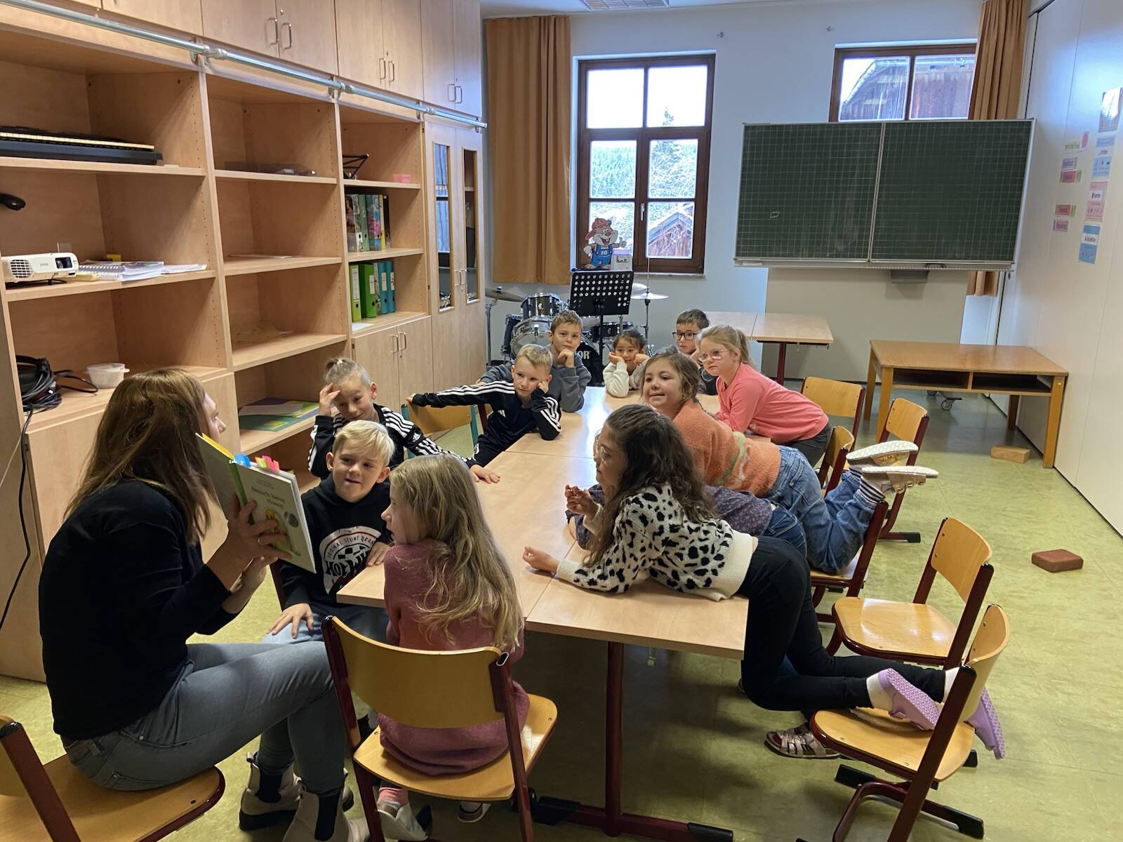 Auch für die Klassen 3 und 4 standen vier unterschiedliche Bücher zur Wahl und hier durften die Schülerinnen und Schüler ebenfalls jeweils zwei Lesungen besuchen – angeboten von ihren Lehrerinnen und als besonderes Schmankerl von Bürgermeister Jürgen Schano.