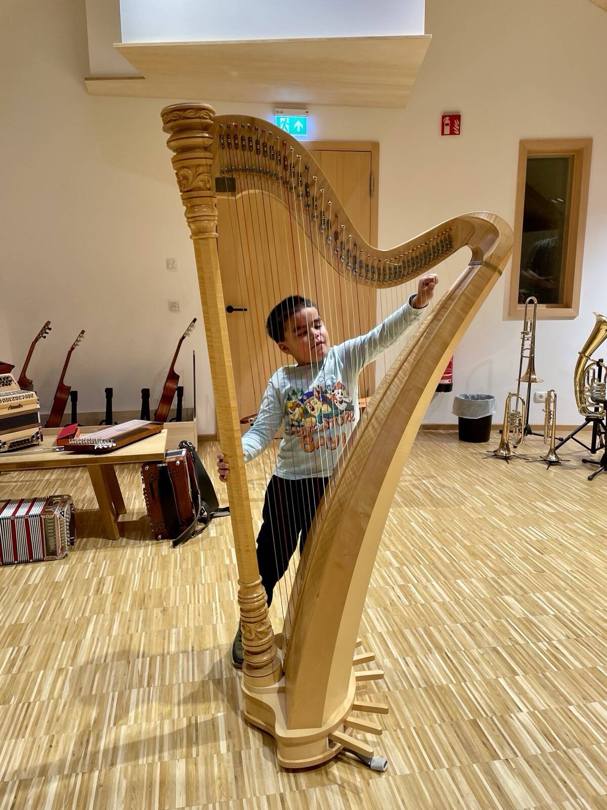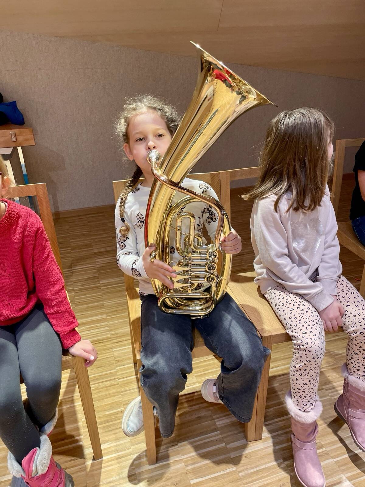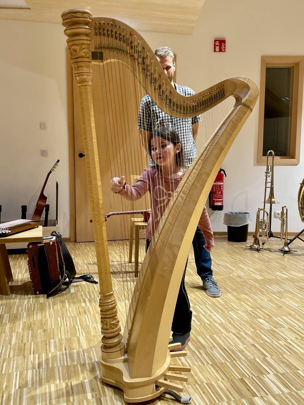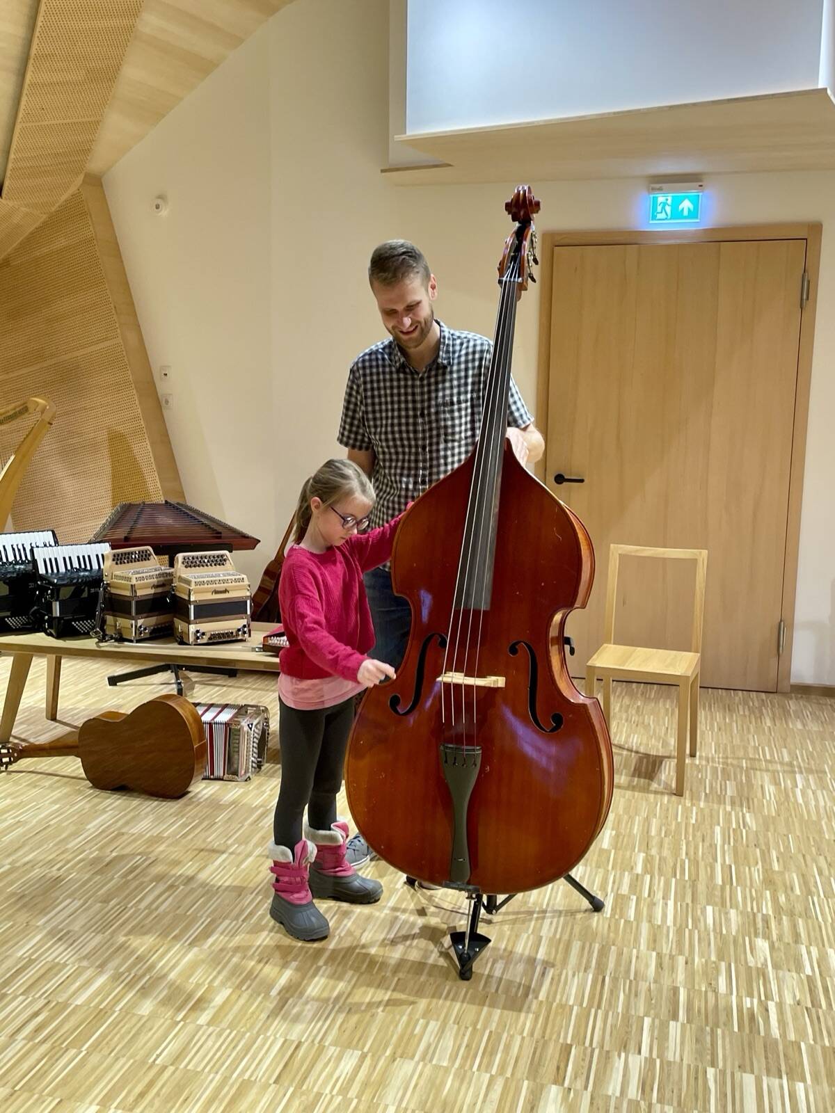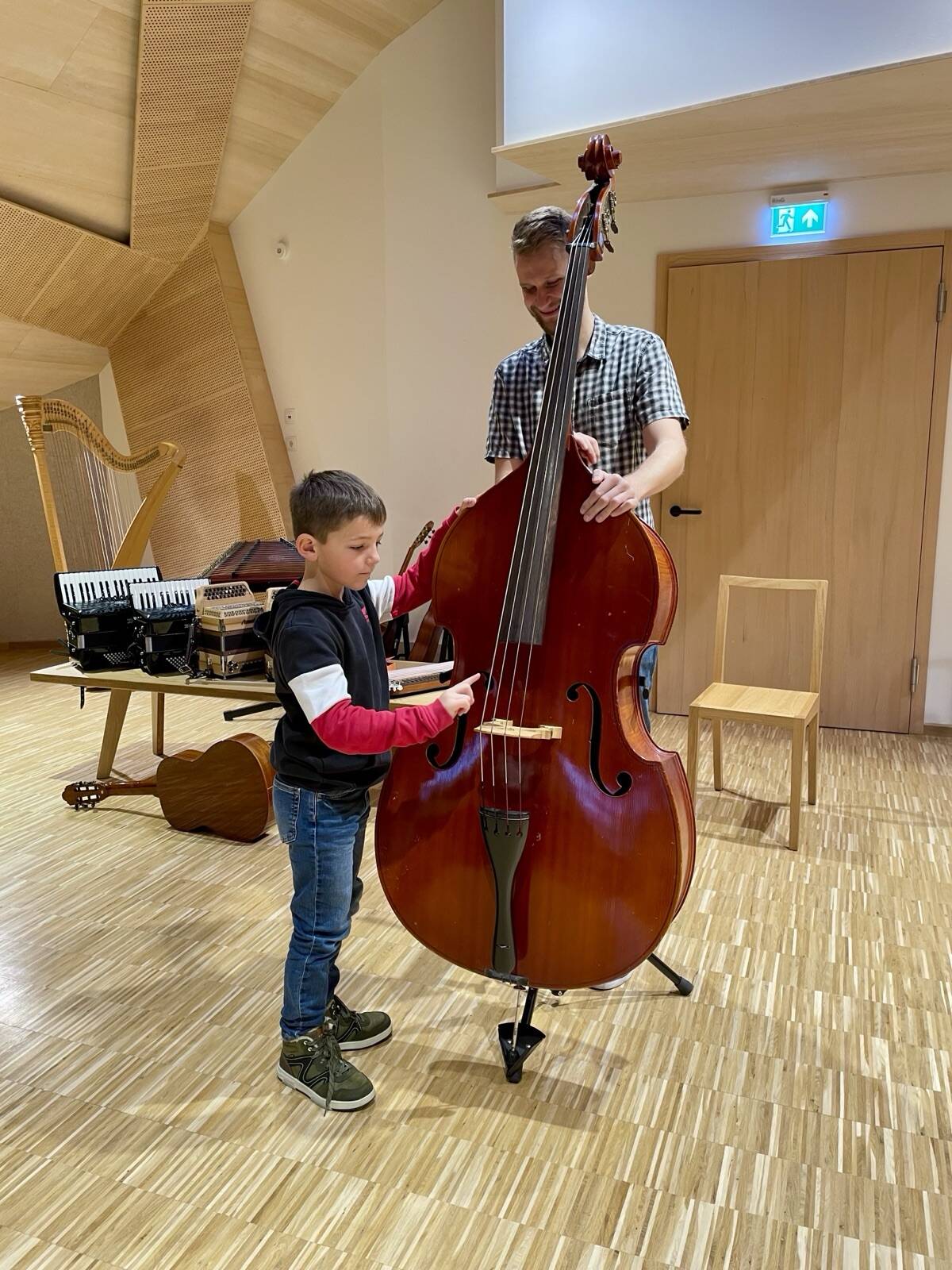 Musiklehrer Dominik Hilgart zeigte den Kindern viele verschiedene Instrumente. Es gab Geigen, Gitarren, eine Harfe, ein Alphorn, die "Steirische" und noch vieles mehr zu entdecken. Am meisten Spaß machte es natürlich, die Instrumente selbst auszuprobieren. Da wurde fleißig gezogen, gedrückt, gezupft, geblasen und gelacht!