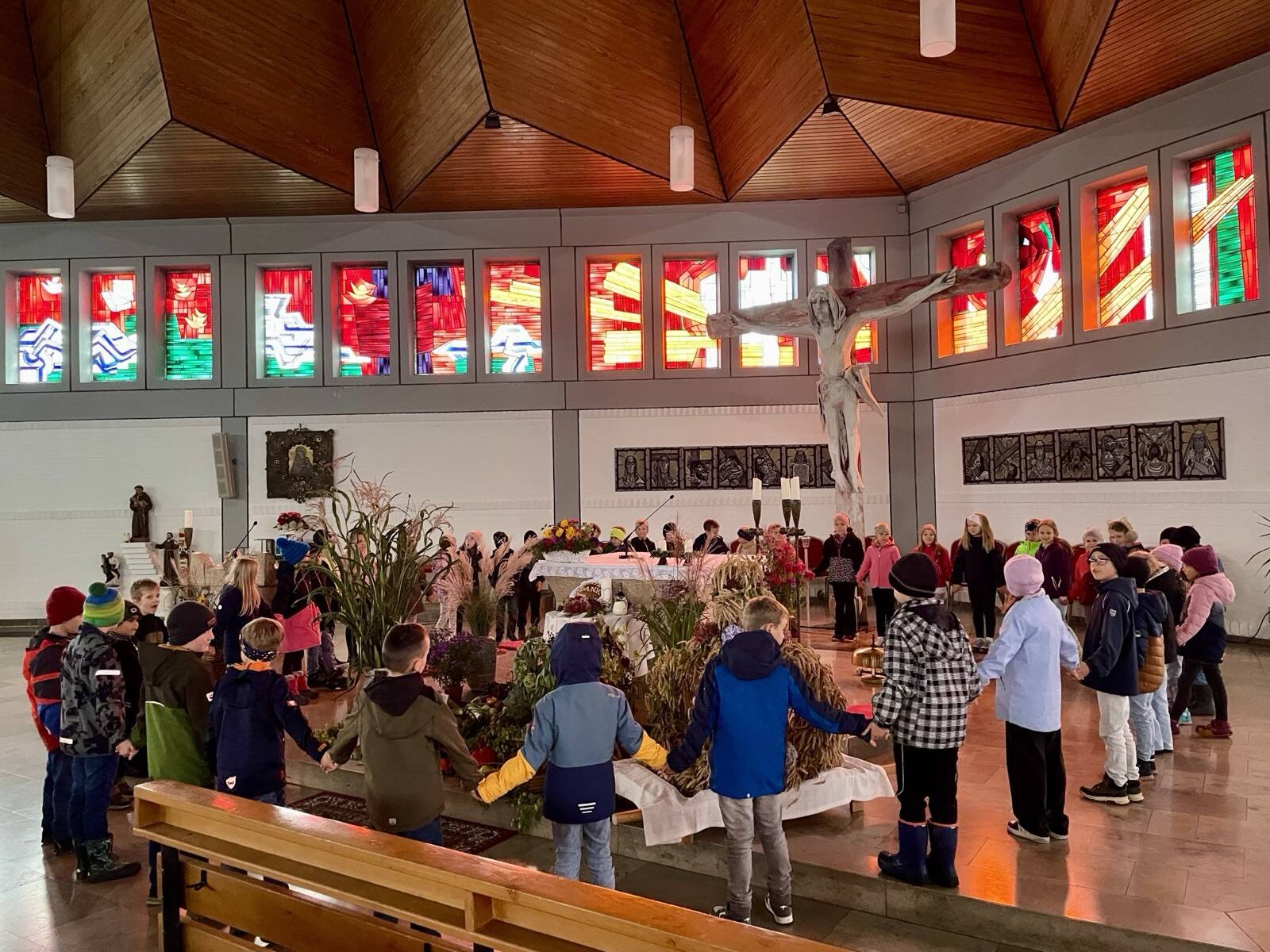 Gemeinsam sangen die Klassen religiöse Lieder und bildeten einen großen Kreis um den Altar, um gemeinsam das "Vater unser" zu beten.