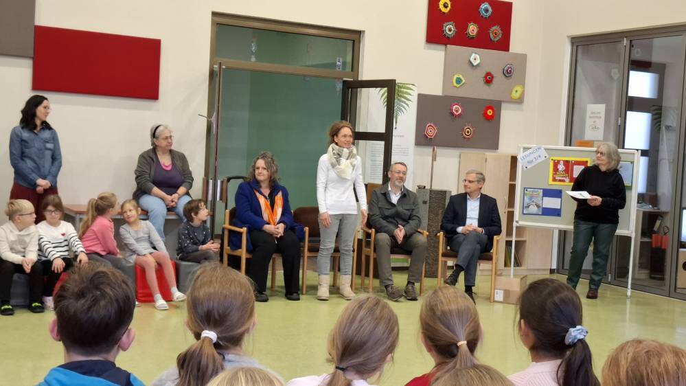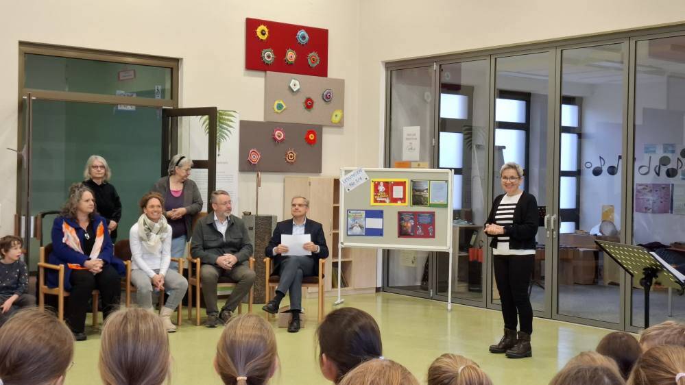 Die Schülerinnen und Schüler Emily Felbinger, Matthias Raab, Max Hell und Marie Draxinger trugen anschließend das Gedicht „Ein Buch ist wie ein Zauberschlüssel“ vor und erinnerten daran, welche Welten das Lesen eröffnen kann. Auch unser Schulverbandsvorsitzender Jürgen Schano sowie Elternvertreterin Mirjam Geier-Köck gratulierten herzlich. Letztere hob die Bedeutung von Büchern und die Wichtigkeit des Vorlesens bereits im Kleinkindalter hervor.