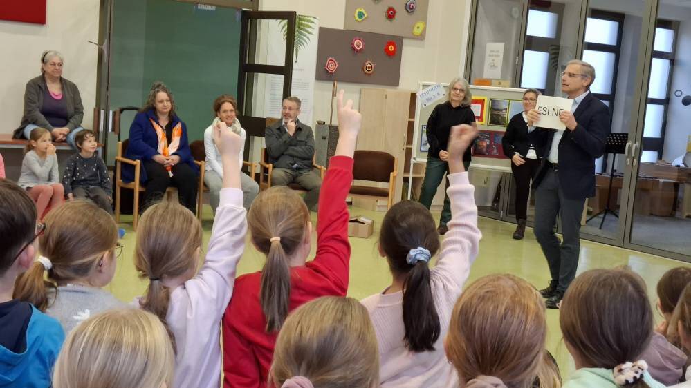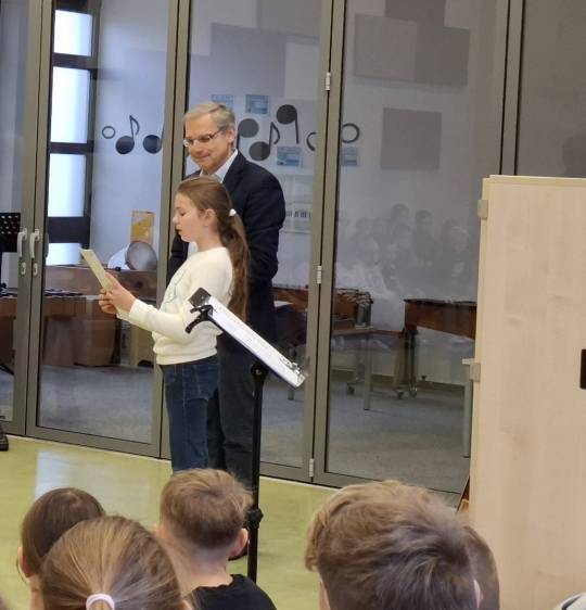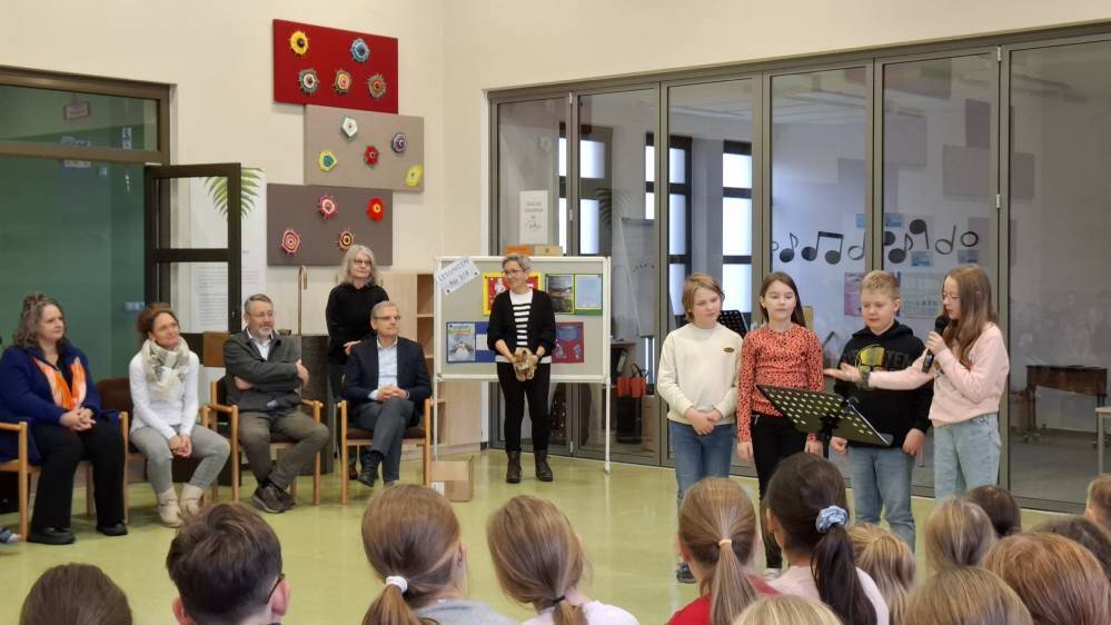 Nach der Begrüßung durch Schulleiterin Astrid Glaser stellte Schulamtsdirektor Wolf humorvolle „Leseaufgaben“ vor: arabische, ukrainische, verdrehte oder völlig durcheinandergeratene Schriftzeichen, die natürlich niemand entziffern konnte. Das sorgte für viele Lacher – und machte eindrucksvoll deutlich, wie komplex der Prozess des Lesens ist. „Wenn man es einmal kann, kann man sich nicht mehr dagegen wehren – dann liest man automatisch, was einem vor die Augen kommt“, erklärte Herr Wolf. Anschließend gratulierte er unserer Schule und insbesondere Frau Wagner und überreichte die Urkunde von Frau Kultusministerin Anna Stolz sowie den Leseluchs. Laura Peterlik aus der Klasse 4c las den Inhalt der Urkunde für alle vor.