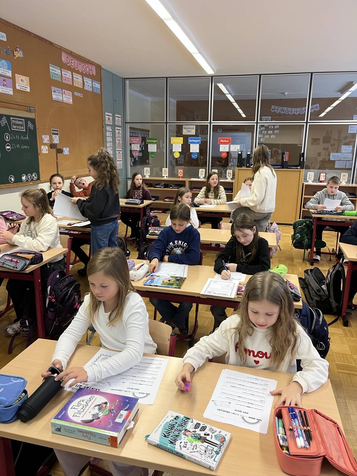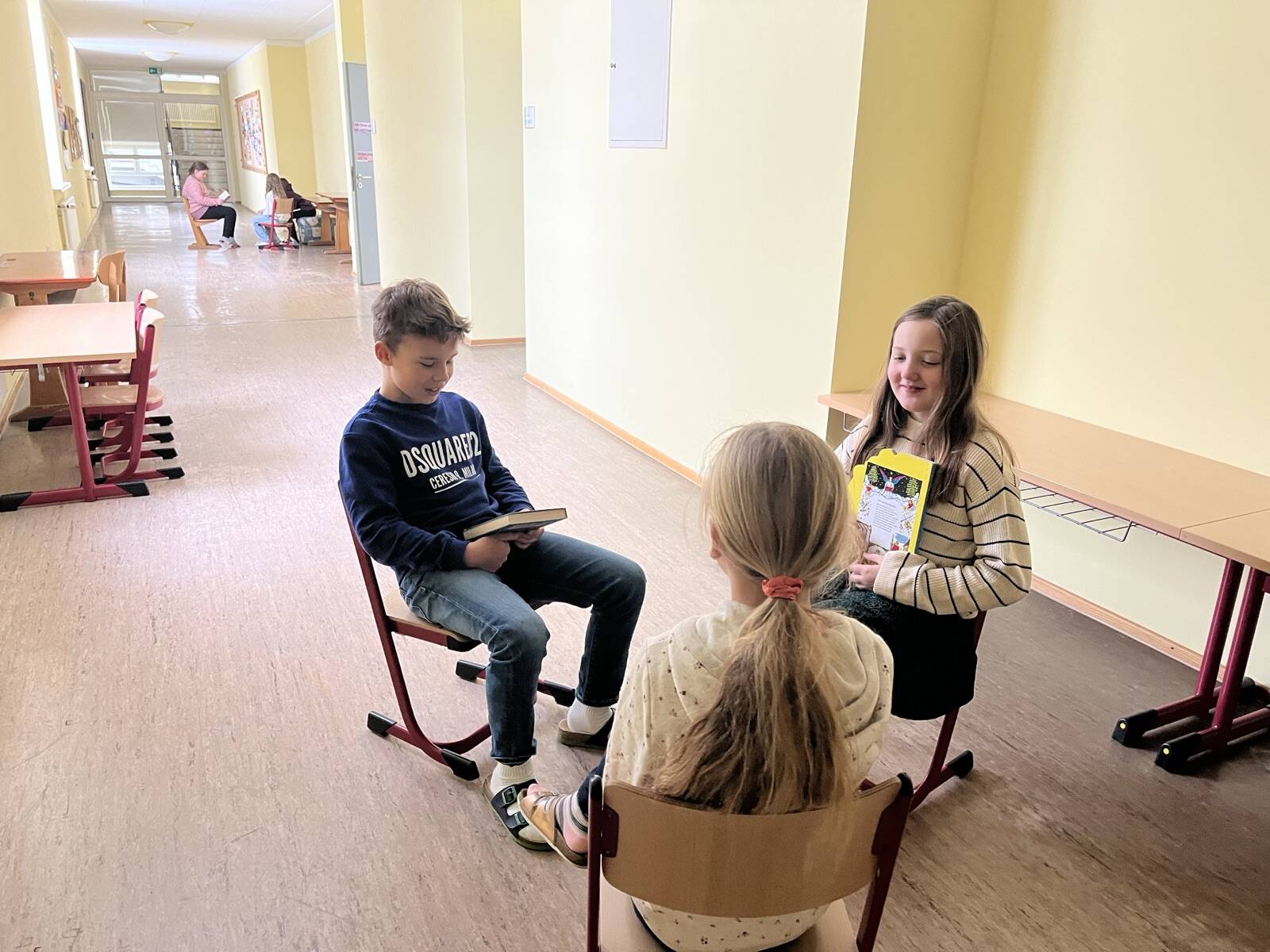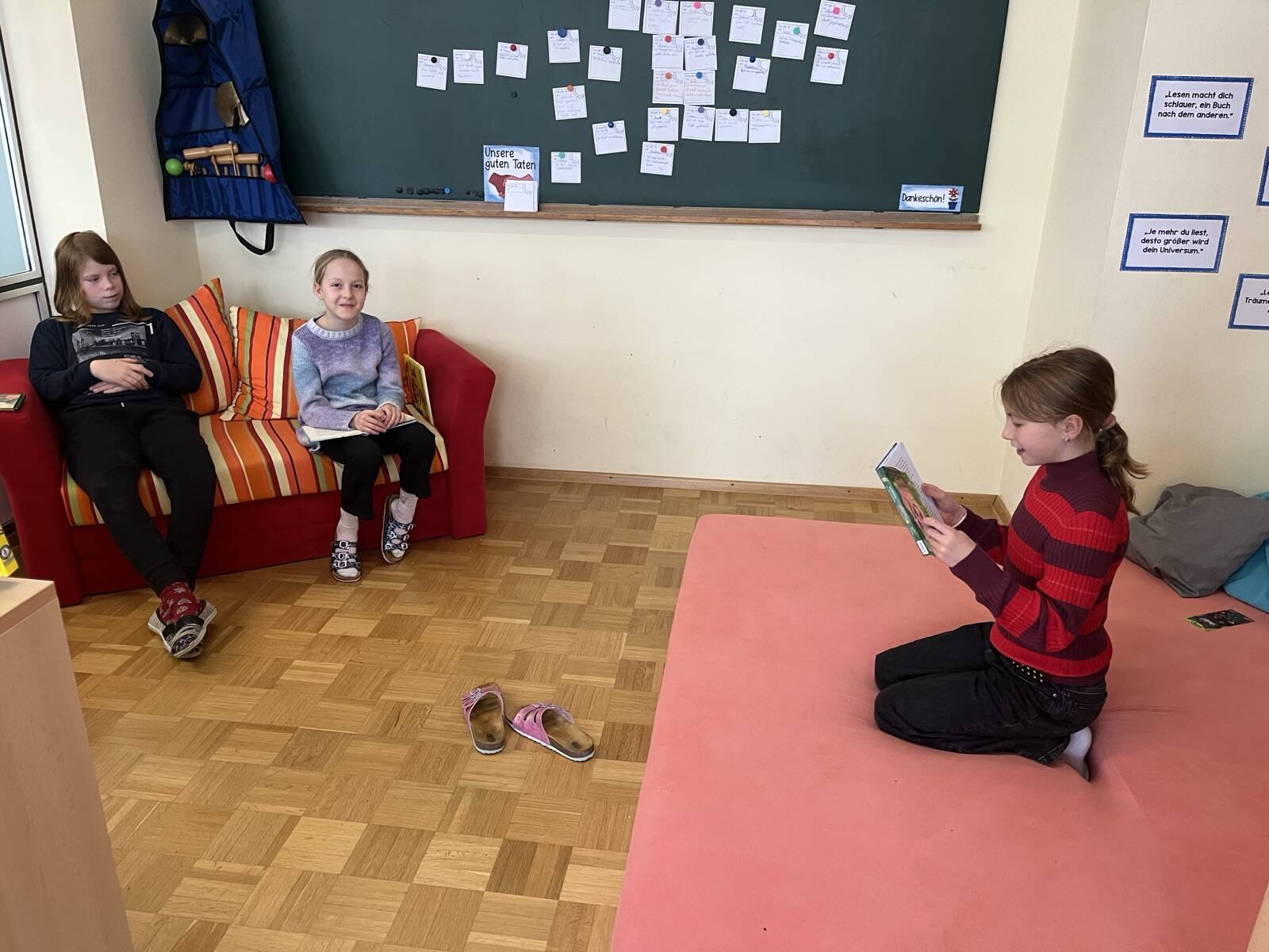 In der Klasse 4a standen die eigenen Lieblingsgeschichten der Kinder im Mittelpunkt. Jedes Kind brachte sein aktuelles Lieblingsbuch mit und las in der Kleingruppe den Klassenkameraden vor. Ein schöner Austausch, der zeigte, wie vielfältig die Lesewelten der Kinder sind. Auch die Viertklässler durften sich noch auf die zwei Gymnasiastinnen und deren Lesevortrag freuen.