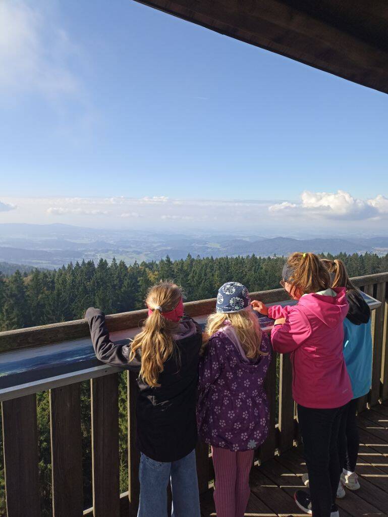 Oben angekommen, wagten sich viele mutig auf den Aussichtsturm und wurden mit einem beeindruckenden Blick über den Bayerischen Wald belohnt. Der Haidel selbst erhebt sich auf stolze 1156 Meter, der Turm misst 35 Meter in der Höhe und wer ganz nach oben wollte, musste 156 Treppenstufen erklimmen. Unter dem Turm wurde gespielt, gesungen und gerätselt: Wie hoch ist der Turm? Wie weit kann man sehen? Wie viele Stufen führen nach oben? Zahlen wurden geschätzt, gemerkt und verglichen. Ein besonderes Highlight war auch der markante Stein auf 1000 Metern über dem Meeresspiegel. Insgesamt legten die Kinder eine Wanderstrecke von 7,9 Kilometern zurück.